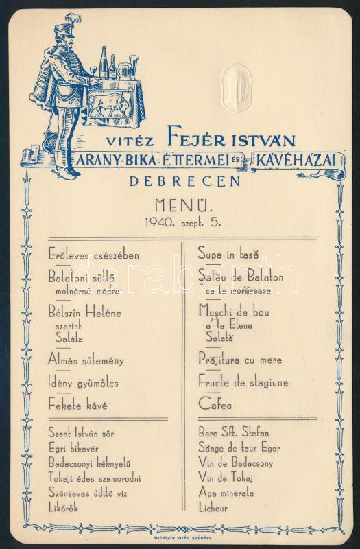 1940 Vitéz Fejér István Aranybika Éttermei, Kávéházai Debrecen menü https://www.darabanth.com/hu/432-Gyorsarveres/432.0/Mutargy-papirregiseg-egyeb/Nyomtatvanyok~1000002/1940-Vitez-Fejer-Istvan-Aranybika-Ettermei-Kavehazai-Debrecen-menu~II2783247