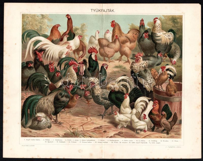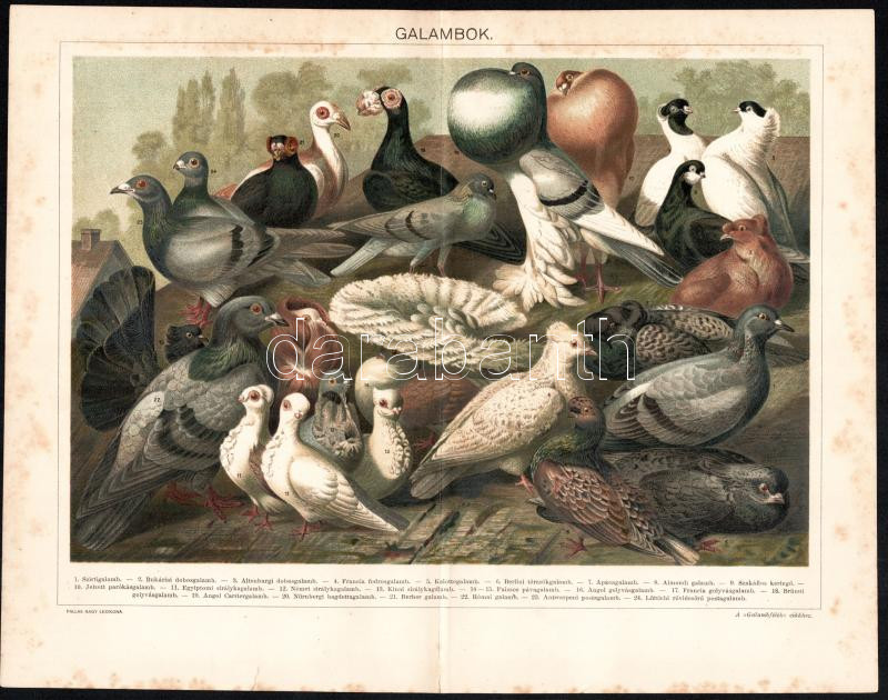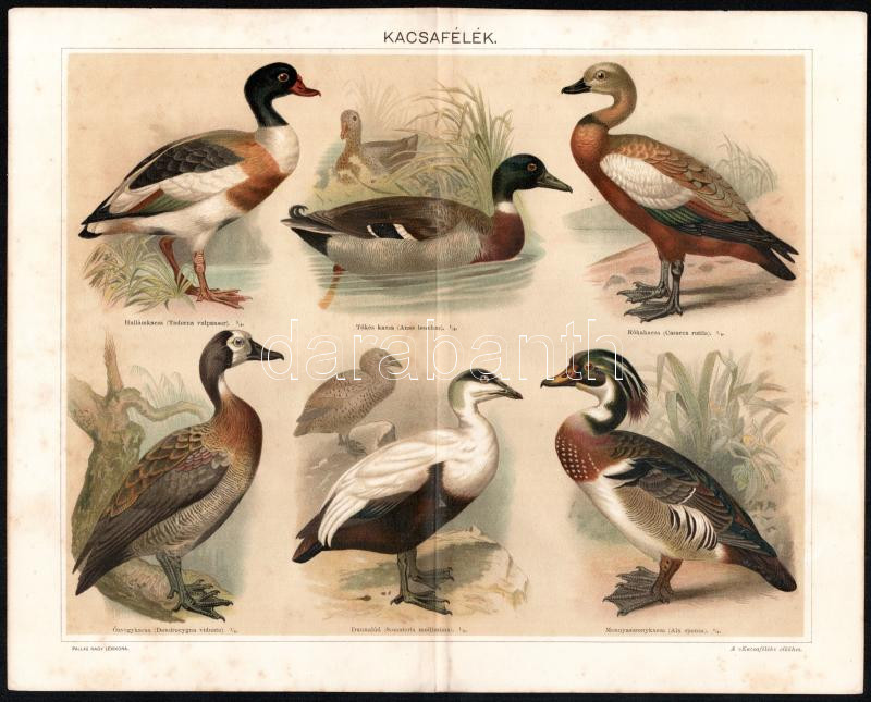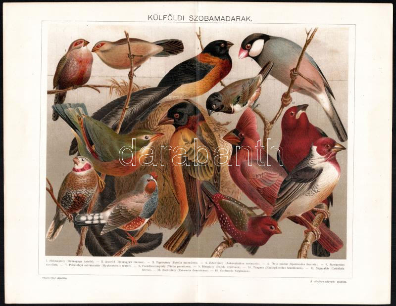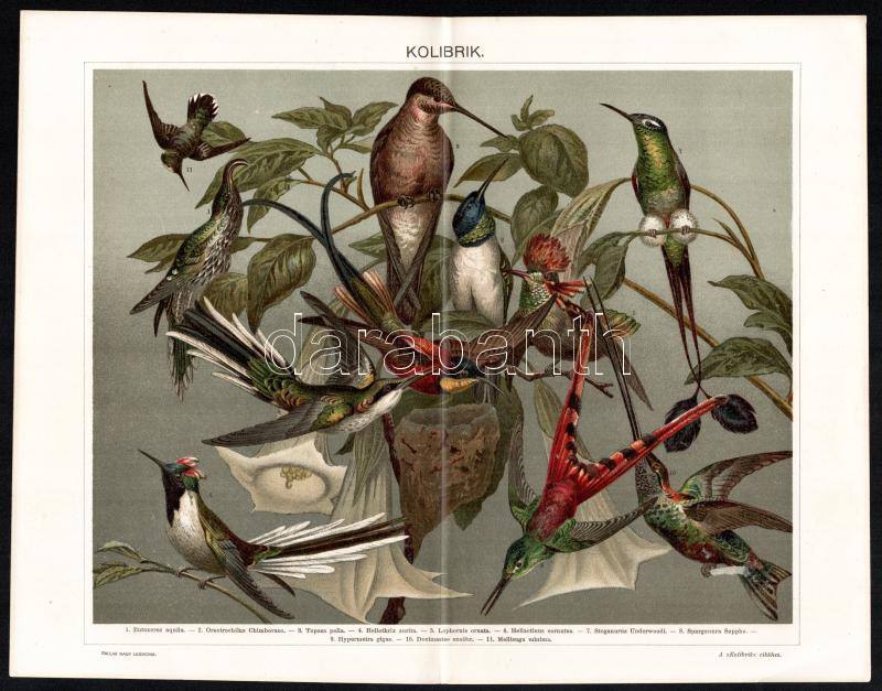 cca 1896 5 db színes madár témájú illusztráció (külföldi szobamadarak, kacsafelék, kolibrik stb.), Pallas Nagy Lexikona, Bp., Posner-ny., helyenként kissé foltos, 24x30 cm