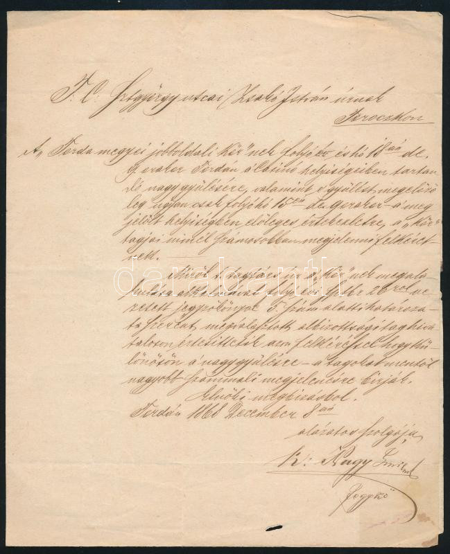 Leírás: 1868 Torda, Nagy Emil jegyző, meghívó levél Jobboldali Kör ülésére