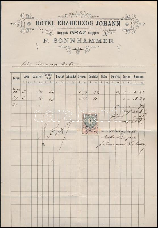 Leírás: 1888 Hotel Erzherzog Johann F. Sonnhammaer Graz fejléces számla 1 kr okmánybélyeggel