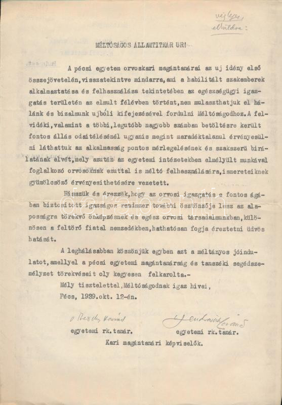 Leírás: 1939 Pécs, Jendrassik Loránd (1896-1970) orvos aláírt levele, saját kezű feljegyzései