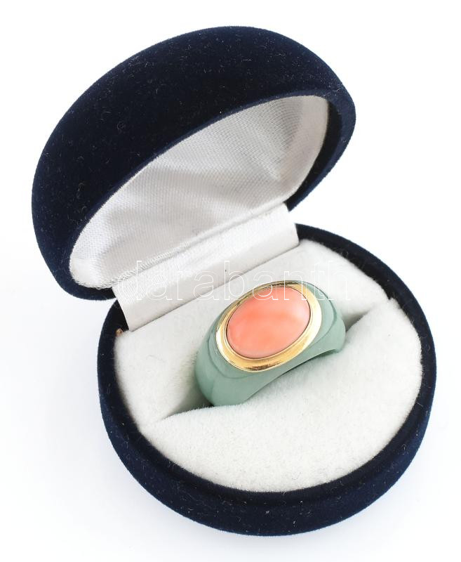 Leírás: Arany (Au/14k) foglalatos, jáde gyűrű, korallal ékítve. Jelzett, m: 56.