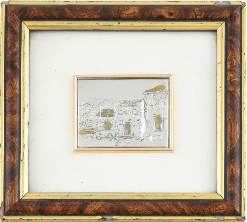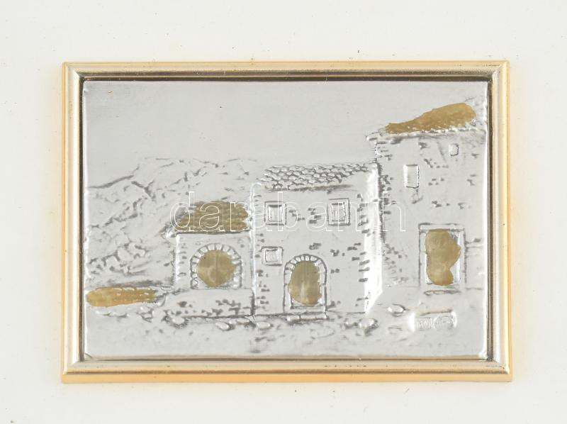 Leírás: Ezüst (Ag) borítású miniatúra, jelzett, sérült kopott, üvegezett keretben. 7,5x9cm