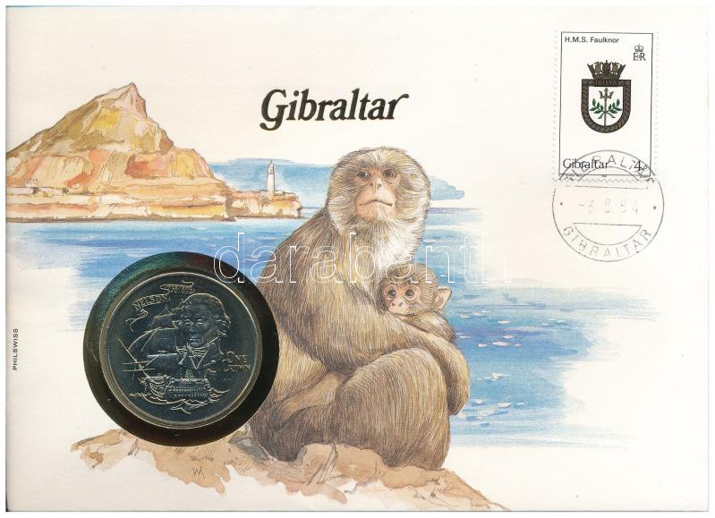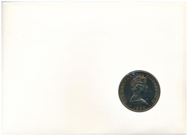 Gibraltár 1980. 1C Cu-Ni "Horatio Nelson halálának 175. évfordulója" forgalomba nem került emlékkiadás felbélyegzett borítékban, bélyegzéssel, német nyelvű leírással T:1- karc Gibraltar 1980. 1 Crown Cu-Ni "175th Anniversary of the death of Lord Horatio Nelson" non-circulating commemorative coin in envelope with stamp, cancellation, and a description in german C:AU scratch Krause KM#12