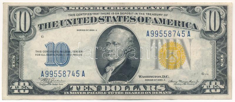 Amerikai Egyesült Államok 1934A 10$ "A99558745A" "Silver Certificate - kisméretű sárga pecsét, Észak-Afrikai katonai kiadás" "William Alexander Julian - Henry Morgenthau Jr." T:III szép papír USA 1934A 10 Dollars "A99558745A" "Silver Certificate - Small size - yellow seal, North African Military Issue, "William Alexander Julian - Henry Morgenthau Jr." C:F fine paper Krause P#415AY