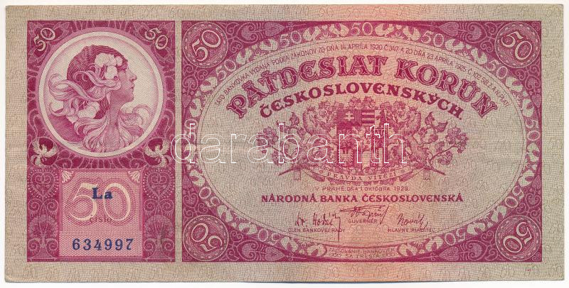 Leírás: Csehszlovákia 1929. 50K "La 634997" T:III szép papír