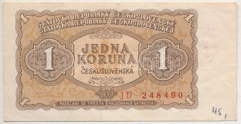 Czechoslovak... https://www.darabanth.com/hu/432-Gyorsarveres/432.0/Numizmatika/Kulfoldi-bankjegyek~1500014/Csehszlovakia-1953-1K-JD-248490-TIII-firka-Czechoslovakia-1953-1-Koruna-JD-248490-CF-doodl~II2777525