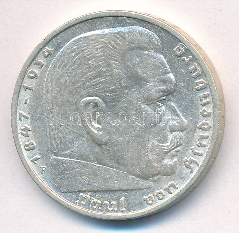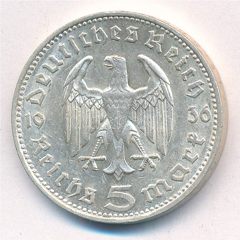 Ger... https://www.darabanth.com/hu/432-Gyorsarveres/432.0/Numizmatika/Kulfoldi-fem-es-ezustpenzek~1500015/Nemet-Harmadik-Birodalom-1936F-5M-Ag-Hindenburg-T1--German-Third-Reich-1936F-5-Mark-Ag-Hinden~II2769440