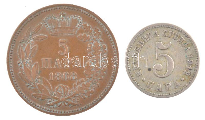 Szerbia 1868. 5p bronz "III. Obrenović Mihály" + 1912. 5p Cu... https://www.darabanth.com/hu/432-Gyorsarveres/432.0/Numizmatika/Kulfoldi-fem-es-ezustpenzek~1500015/Szerbia-1868-5p-bronz-III-ObrenoviC487-Mihaly-plus-1912-5p-Cu-Ni-T2--Serbia-1868-5-Para-bronze-~II2784644