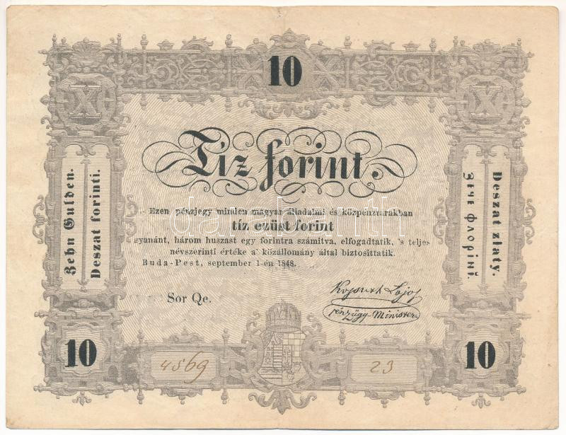 Leírás: 1848. 10Ft "Kossuth bankó" "Qc. 4569 23" T:III kis beszakadások
