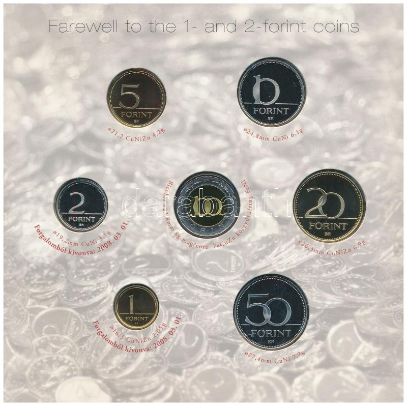 Leírás: 2008. 1Ft-100Ft (7xklf) "Búcsú az egy- és kétforintostól" forgalmi sor szettben T:PP