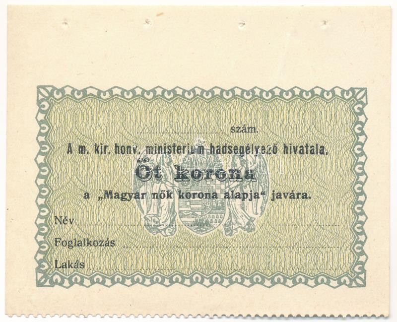 Leírás: Budapest 1914-1919. 5K "Magyar nők korona alapja II." számozás nélkül, kitöltetlen T:I- Adamo BUB-15