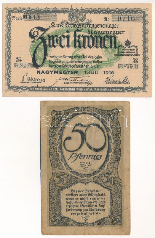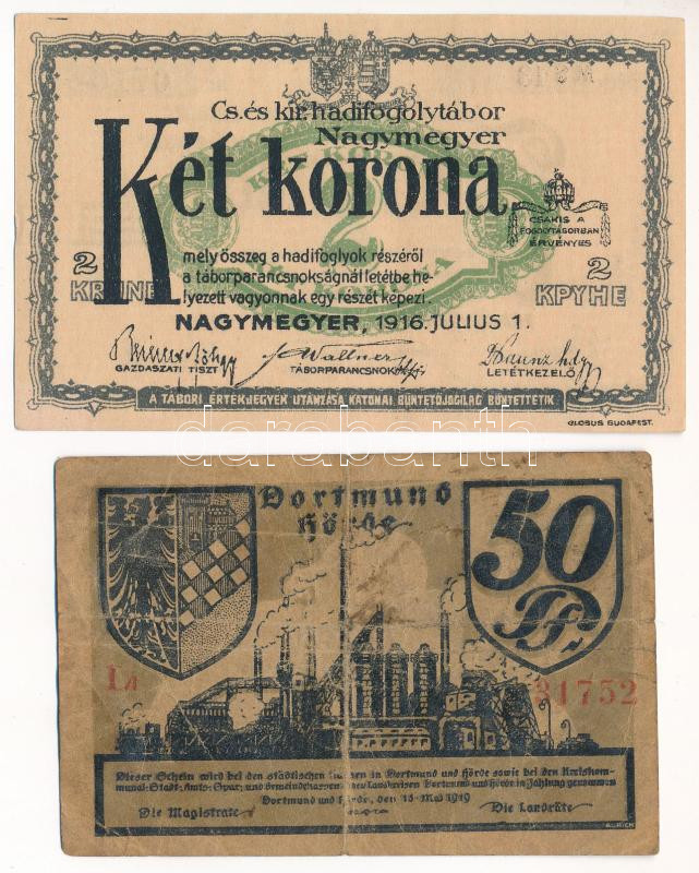 Nagymegyer / Hadifogolytábor 1916. július 1. 2K arab sorozat- és sorszámmal, "MS" betűjelzéssel + Német Birodalom / Weimari Köztársaság / Dortmund 1919. 50pf szükségpénz (notgeld) T:II,III-