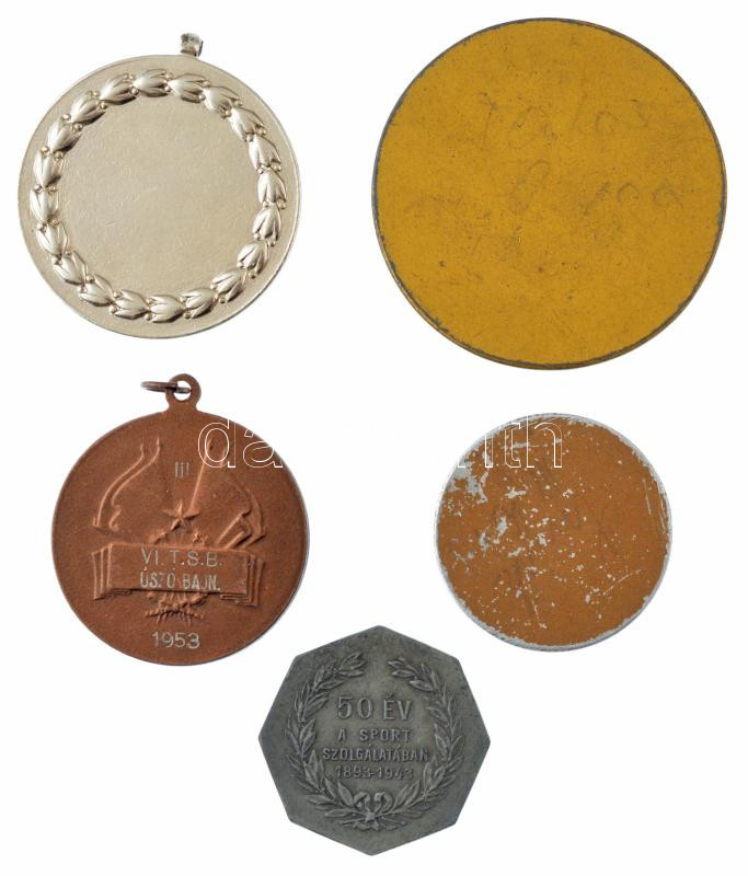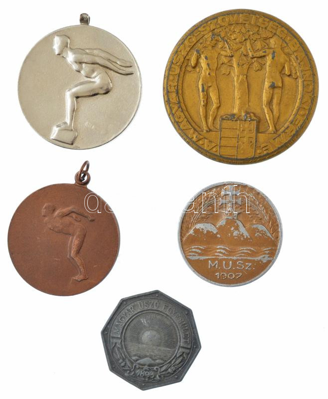 ~1920-1960. Úszó díjérmek (5xklf) közte Göröntsér Greff Lajos (1888-1976) 1920. "A Magyar Úszószövetség Bajnoki Érme" egyoldalas aranyozott Zn díjérem, (50mm) 1943. "Magyar Úszó Egyesület / 50 év a sport szolgálatában" nyolcszögletű Zn emlékérem (30mm) T:1- - 2- patina