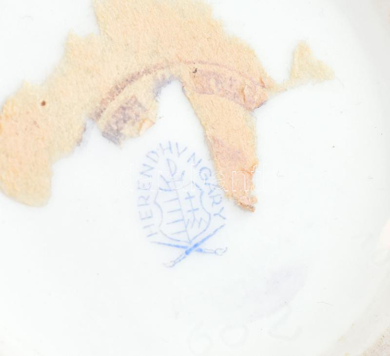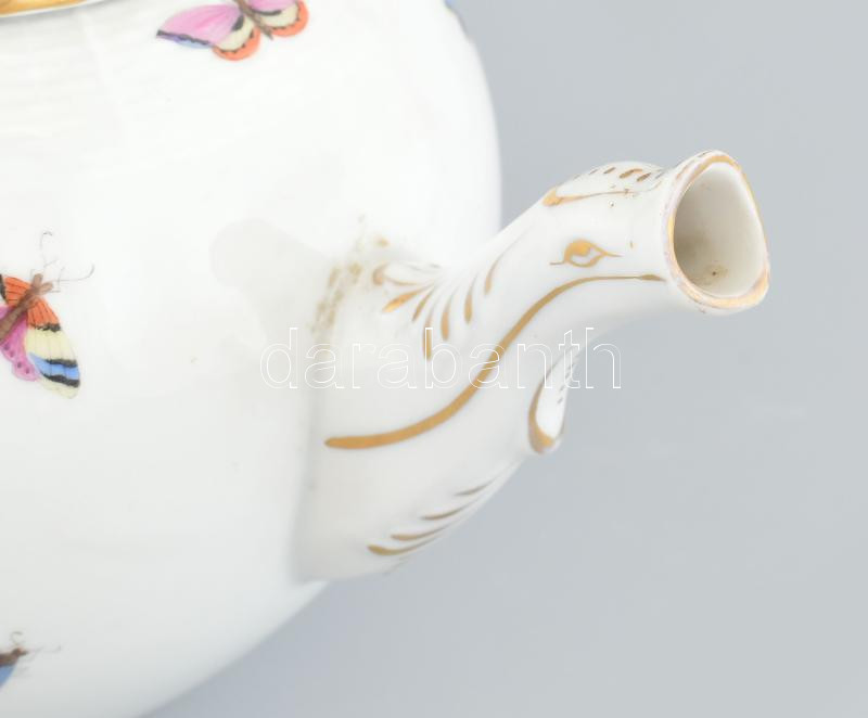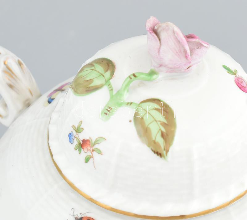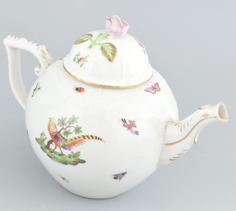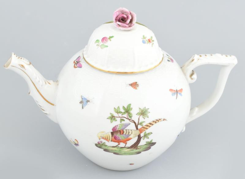 Leírás: Herendi fácános teáskanna, rózsán lepattanások, kopott, jelzett, m: 18 cm
