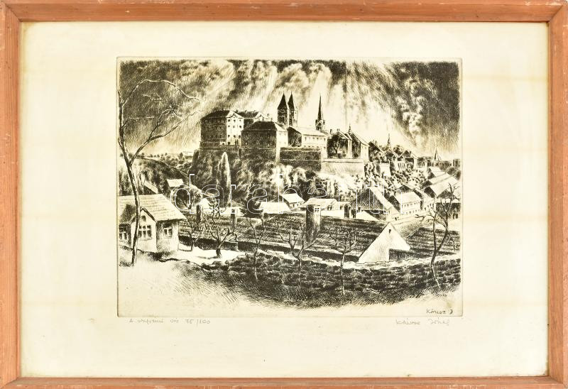 Leírás: Kórusz József (1927-2010):A veszprémi vár. Rézkarc, papír jelzettm, számozott (75/100). Kissé foltos, elszíneződött. Üvegezett fakeretben. 29,5x38 cm