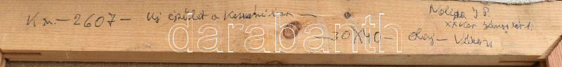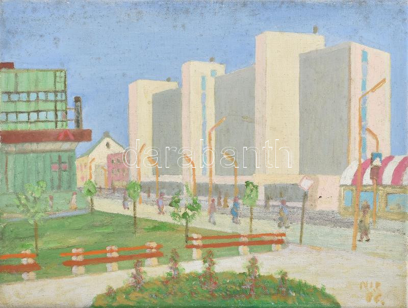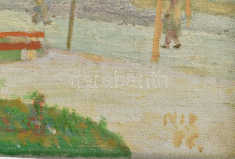 Leírás: Nolipa István Pál (1907-1986): Pesterzsébet, új épület a Kossuth téren. Olaj, vászon. Jelezve jobbra lent, hátoldalán autográf felirattal. 30x40 cm