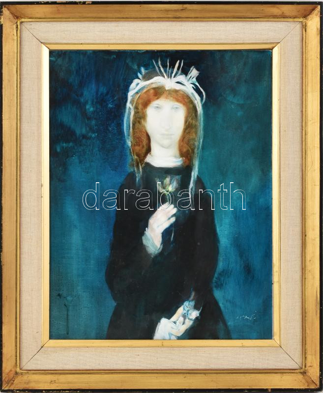Szász Endre (1926-2003): Hölgy virággal. Olaj, falemez, jelezve jobbra lent. Proveniencia: vásárlása közvetlen a művésztől, Szász Endrétől. 45x34 cm. Dekoratív fa keretben.