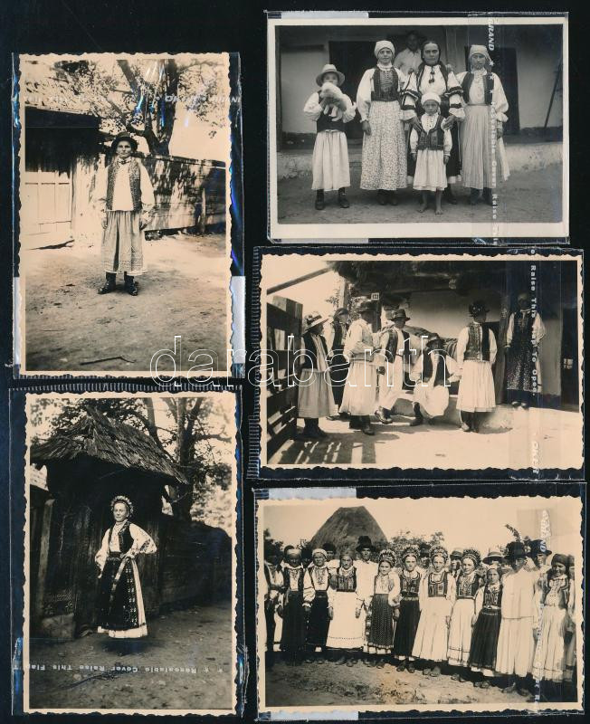 1935 Felsőfüld (Erdély), román népviseletek, 5 db hátoldalán feliratozott vintage fotó, jelzés nélkül, 6×9 cm / 1935 Fildu de Sus, Transylvania, 5 photos, with Hungarian desciption on the reverse, unsigned