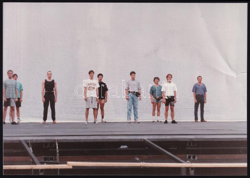 Leírás: Színpadi próba (Sasvári Sándor, Kanyó Béla, stb.), 3 db színes fotó, Kanyó Béla (1939-2020) jelzett felvételei, 18x12,5 cm