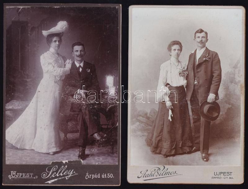 Leírás: cca 1900 Házaspár portréi, 2 db keményhátú fotó újpesti műtermekből, kopásnyomokkal, 16,5×10,5 cm