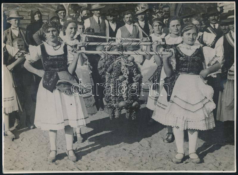 cca 1930 Szüreti ünnepség Magyarországon, Németországban publikált eredeti sajtófotó, hátoldalon pecséttel és felirattal, felületén törésnyomok, 17×23 cm