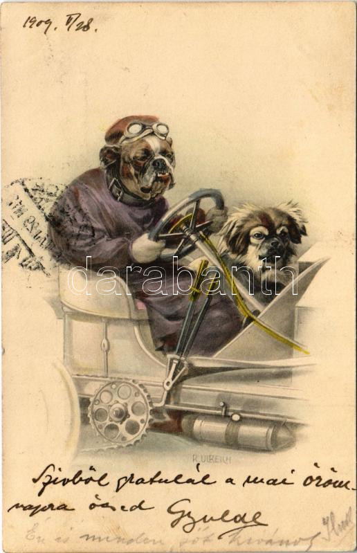 1909 Kutya sofőr / Dog automobile driver. M. M. Nr. 393. s: R. Ulreich https://www.darabanth.com/hu/433-Gyorsarveres/433.0/Kepeslapok/Allat~1500025/1909-Kutya-sofor-Dog-automobile-driver-M-M-Nr-393-s-R-Ulreich~II2797293