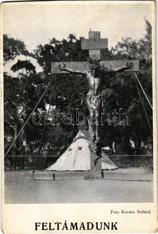 1933 Feltámadunk! A kép bal sarkában, Krisztus jobb kezénél a falombok a természet csodálatos játékából Nagy-Magyarország és Csonka-Magyarország képeit mutatják. Kiadja a Magyar Nemzeti Szövetség. Kovács Szilárd felvétele. Gödöllő IV. Cserkész Jamboree / Hungarian boy scout camp, Hungarian irredenta propaganda, World Scout Jamboree (vágott / cut)