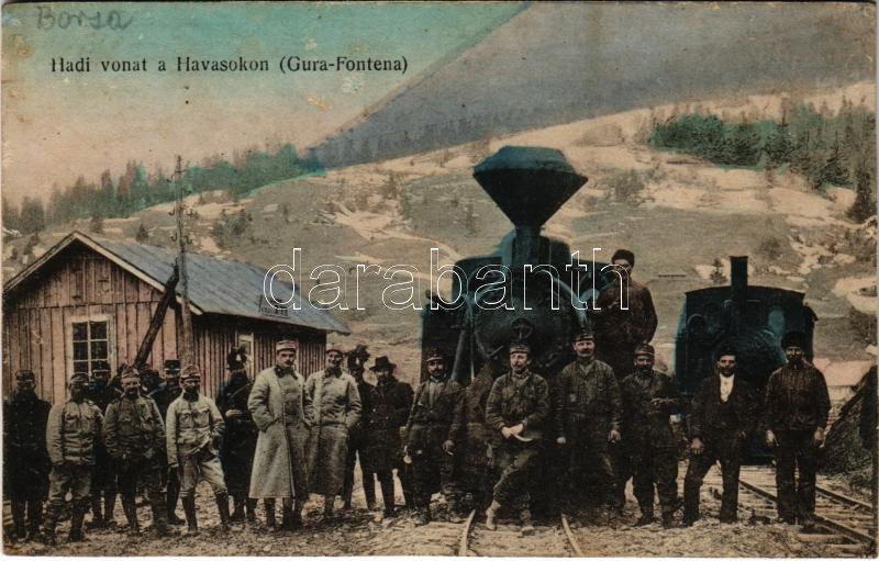 1917 Gura-Fontena, Gura fo utina, Borsafüred (Máramaros, Maramures); Hadivonat a Havasokon (Gura-Fontena). Első világháborús osztrák-magyar vasútállomás a Borsa-Priszlop-Jakobeny keskeny nyomtávolságú gőzüzemű tábori vasútvonalon az erdélyi hegyekben. K.u.K. Prislopbahn gőzmozdony és katonák, vonat. Vider Hers kiadása / WWI Austro-Hungarian military railway station of the Borsa-Prislop-Iacobeni narrow gauge steam powered field railroad in the Transylvanian mountains, soldiers and locomotive (r)