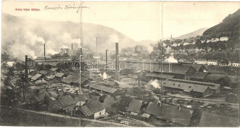 Leírás: Anina, Stájerlakanina, Steierdorf, Staier; Vasgyár, iparvasút, fűrésztelep. Hubert Zsigmond kiadása, kihajtható 3-részes panorámalap / iron works, industrial railway, sawmill (r)