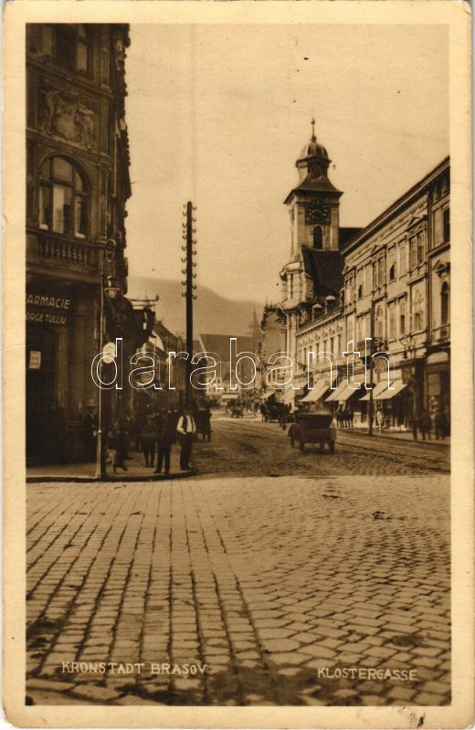 Brassó, Kronstadt, Brasov; Kolostor utca, templom, üzletek, Tulliu gyógyszertár / Klostergasse. Phot. Gustav Koch / street view with church and shops, pharmacy (EK)