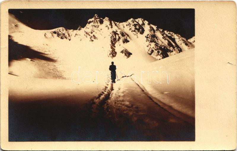 Leírás: Fogarasi-havasok (Fogarasi Kárpátok), Fogarascher Karpathen, Muntii Fagarasului; Pe Lacul inghetat, Balea, Lacul Balii / Buleasee / fagyott Bilea-tó, síelő, téli sport / frozen lake, ski, winter sport (szakadás / tear)