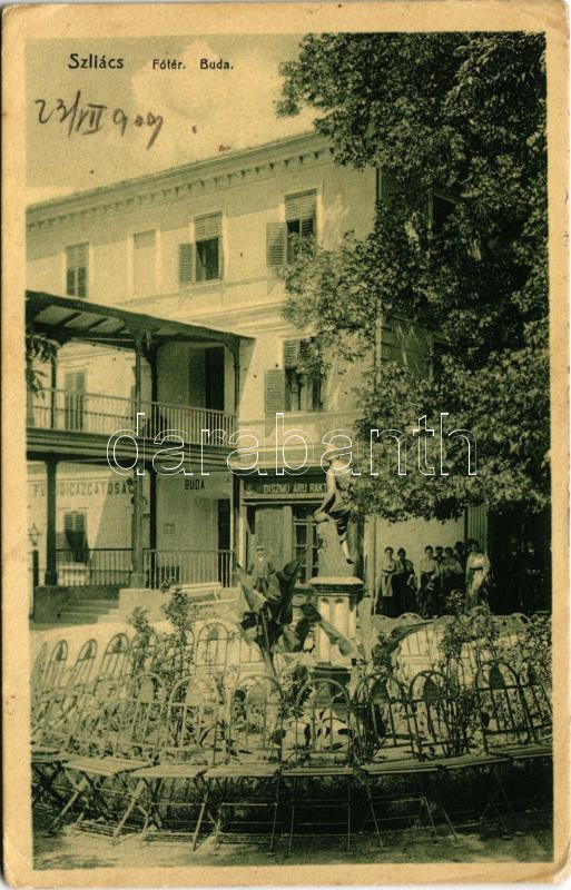 1909 Szliács, Sliac; Fő tér, Buda szálloda, díszműraktár, fürdőigazgat... https://www.darabanth.com/hu/433-Gyorsarveres/433.0/Kepeslapok/Felvidek~1500008/1909-Szliacs-Sliac-Fo-ter-Buda-szalloda-diszmuraktar-furdoigazgatosag-Kerekes-MiklC3~II2792347