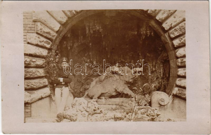 Leírás: Budapest (?), vadászati szoborcsoport vízeséssel, vaddisznót elejtő vadász kutya. photo (EK)