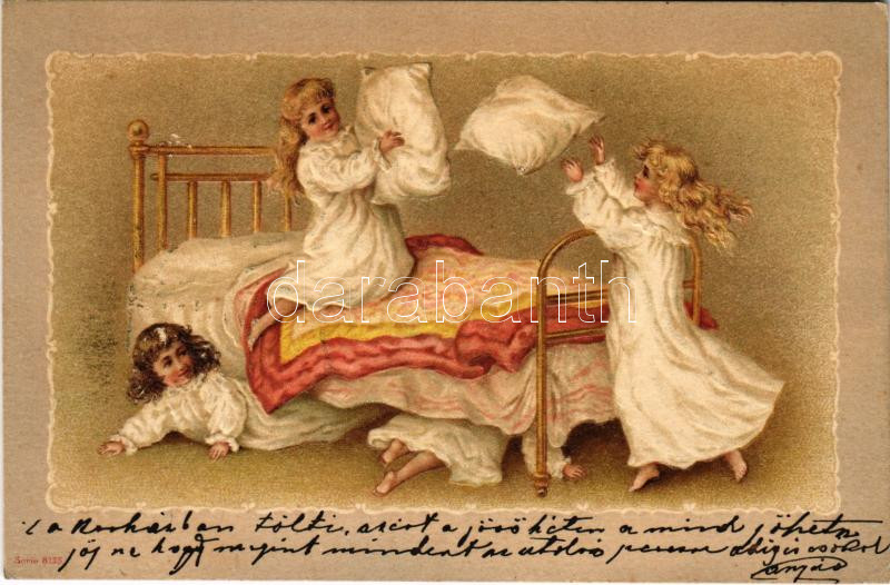 1902 Girls' pillow fight. Emb. litho (lyuk / pinhole) https://www.darabanth.com/hu/433-Gyorsarveres/433.0/Kepeslapok/Muveszlapok~1500069/1902-Girls-pillow-fight-Emb-litho-lyuk-pinhole~II2789981