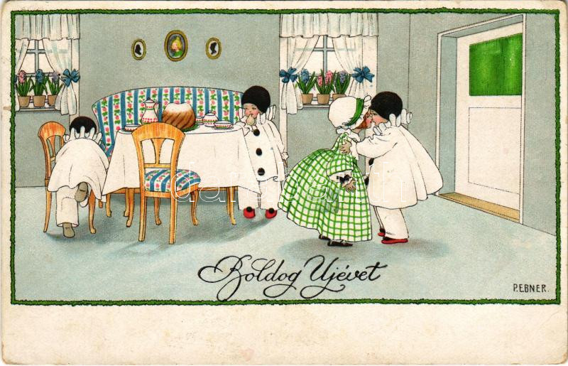 Leírás: 1931 Boldog Újévet / New Year greetings with clowns. M. M. Nr. 1235. s: P. Ebner (EB)