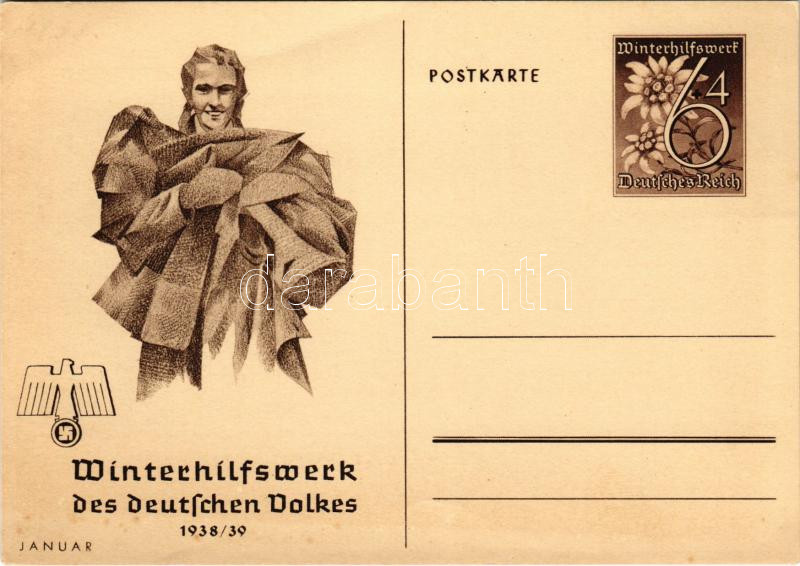 Winterhilfswerk (WHW) des deutschen Volkes 1938-39 Januar / "Winter Relief of the German People" NSDAP Nazi Party propaganda, working class, swastika; 6+4 Ga.