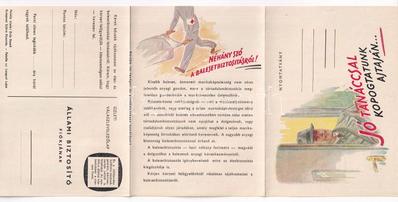 Leírás: Jó tanáccsal kopogtatunk ajtaján... Állami Biztosító fiók 3-részes kinyitható reklám képeslapja / Hungarian insurance company advertisement. 3-tiled folding postcard