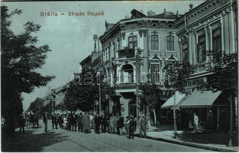 Leírás: Braila, Strada Regala, Farmacia Minerva, Universal / street, pharmacy, shops. Georges Kostomyris