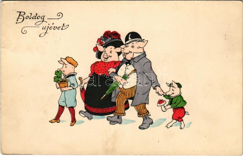 1912 Boldog Újévet! / New Year greeting art postcard with pig family. ... https://www.darabanth.com/hu/433-Gyorsarveres/433.0/Kepeslapok/Udvozlolapok-Unnepek~1500090/1912-Boldog-Ujevet-New-Year-greeting-art-postcard-with-pig-family-HHiW-Nr-973-EK~II2797424