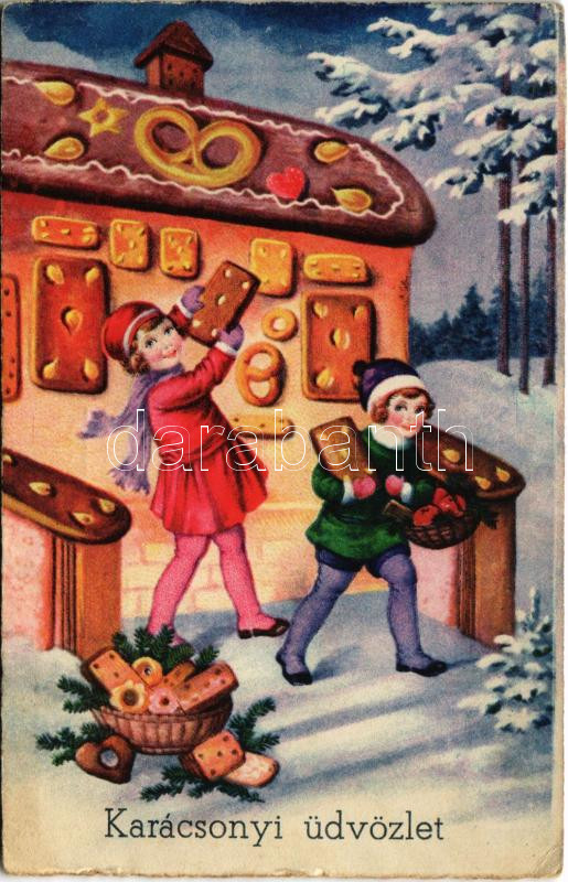 1938 Karácsonyi üdvözlet / Christmas greeting art postcard with ginger... https://www.darabanth.com/hu/433-Gyorsarveres/433.0/Kepeslapok/Udvozlolapok-Unnepek~1500090/1938-Karacsonyi-udvozlet-Christmas-greeting-art-postcard-with-gingerbread-house-Rokat-1416-E~II2789969