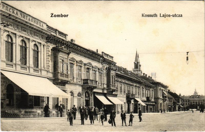 Leírás: 1908 Zombor, Sombor; Kossuth Lajos utca, Knipl Gáspár sörcsarnoka, bank és bizományi üzlet, Schlieszer Testvérek üzlete / street, beer hall, shops (EK)
