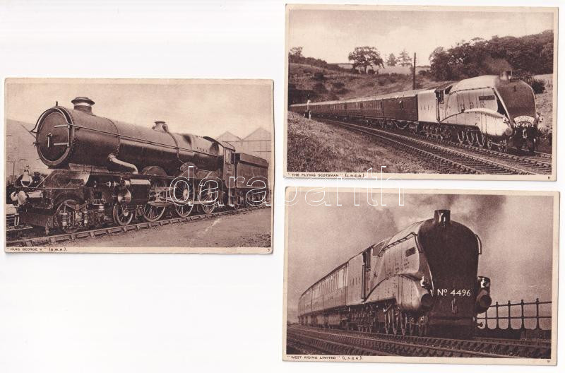 3 db RÉGI angol vasúti képeslap, gőzmozdonyok / 3 pre-1945 British railway postcards with locomotives: King Georg V, West Riding Limited, The Flying Scotsman