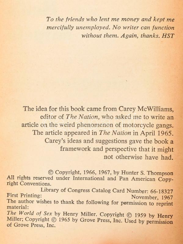 Hunter S. Thompson: Hell's Angels. A strange and terrible saga. New York,1967,Ballatine Books. In English language. First printing (November, 1967.) Paperback.