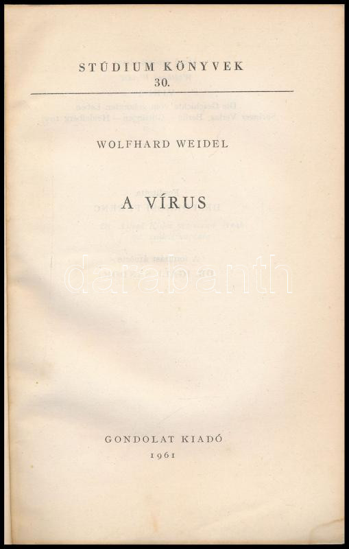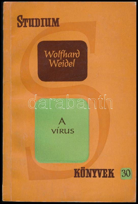 Wolfhard Weidel: A vírus. Stúdium Könyvek 30. Bp., 1961., Gondolat. Ki... https://www.darabanth.com/hu/433-Gyorsarveres/433.0/Konyvek/Konyvek-Termeszettudomany-medicina~1000015/Wolfhard-Weidel-A-virus-Studium-Konyvek-30-Bp-1961-Gondolat-Kiadoi-papirkotes~II2790243