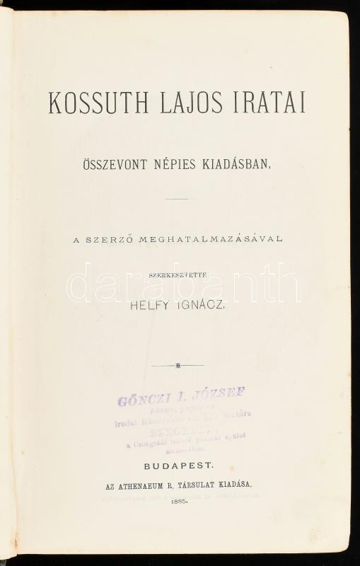Helfy Ignác (szerk.): Kossuth Lajos iratai összevont népies kiadásban.... https://www.darabanth.com/hu/433-Gyorsarveres/433.0/Konyvek/Konyvek-Tortenelem~1000010/Helfy-Ignac-szerk-Kossuth-Lajos-iratai-osszevont-nepies-kiadasban-Bp-1885-Athenaeum-Kia~II2790643