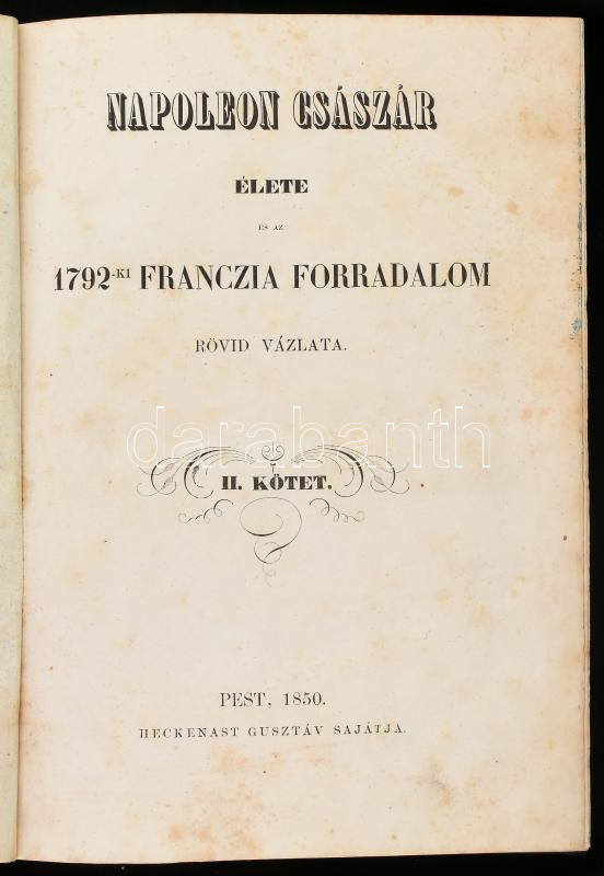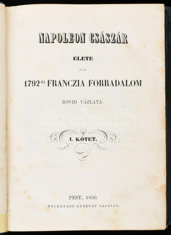 Napoleon császár élete és az 1792-ki franczia forradalom rövid vázlata I-II. köt. Pest, 1850, Heckenast Gusztáv, 8+480 p., 4+419 p. Első magyar nyelvű kiadás. Átkötött félvászon-kötés, márványozott lapélekkel, kopott, foltos borítóval, (foxing) foltos lapokkal.
