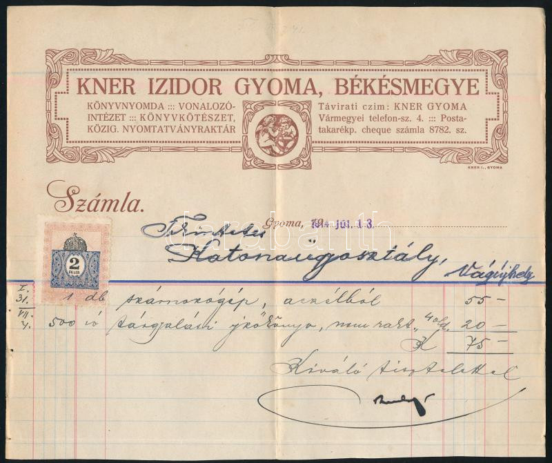 Leírás: 1914 Kner Izidor aláírt fejléces számlája