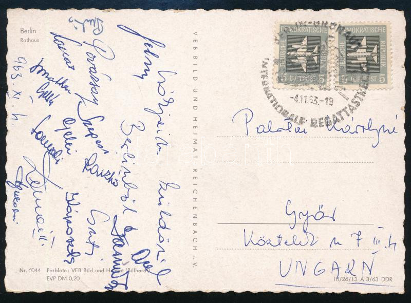 1963 Berlin, a következő évben a tokiói olimpián aranyérmet szerző magyar labdarúgó-válogatott tagjainak aláírásai a felkészülésről hazaküldött képeslapon: Szepesi Gusztáv, Gelei József, Povázsai László, Palotai Károly ("Csuti"), Káposzta Benő, Dunai Antal (Dunai II.), Lakat Károly szövetségi kapitány, stb. (össz. 16 db aláírás)