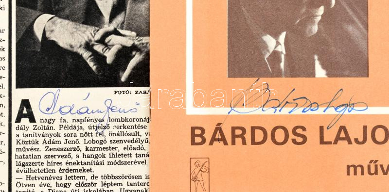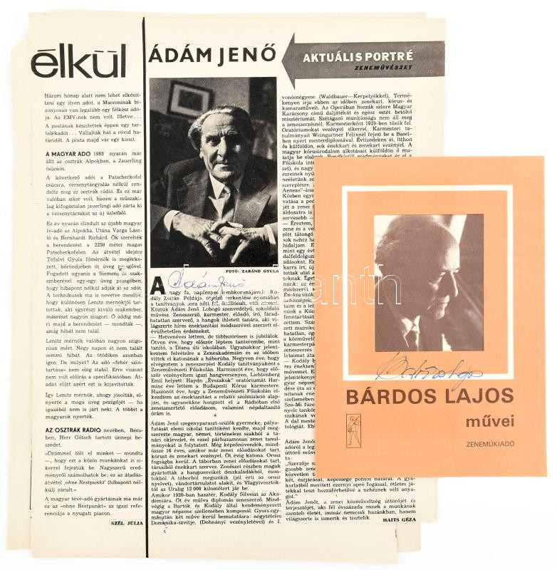 Leírás: Bárdos Lajos, Ádám Jenő, Farkas Ferenc és Szokolay Sándor zeneszerzők autográf aláírásai róluk szóló kiadványon és újságcikkeken